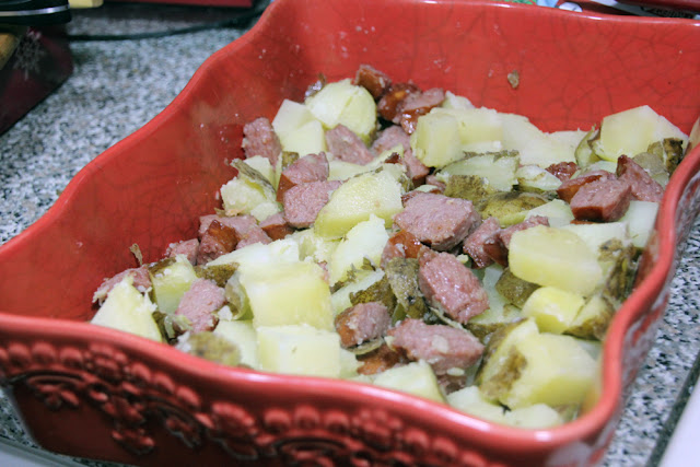 Pour the cheese mixture over the potatoes and smoked sausage.