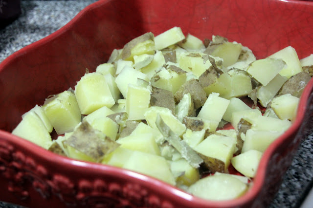 Once the potatoes are finished cooking, cut them into cubes and place in a casserole dish.