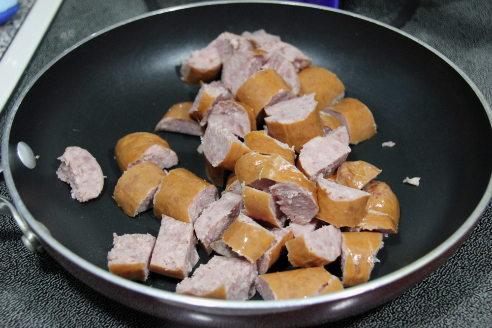 While the potatoes are boiling, cut the sausage in half, lengthwise, and slice into small pieces. Cook in a skillet until slightly brown, about 12 minutes.