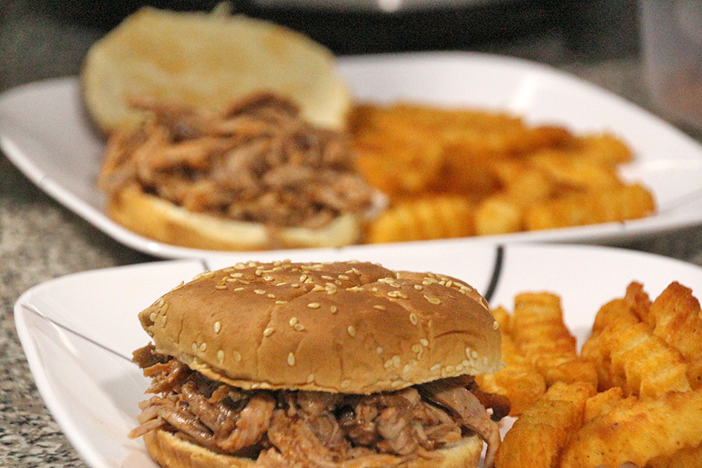 Toast the hamburger buns, top with the shredded pork, and enjoy!