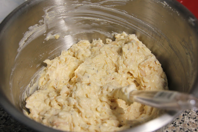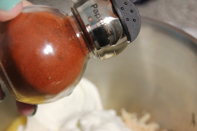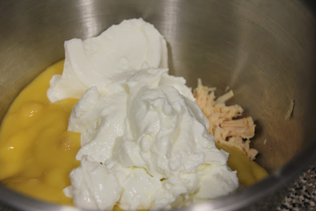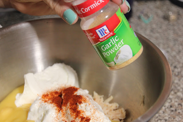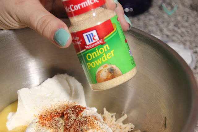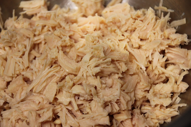 After you’ve preheated your oven to 350, and lightly sprayed a casserole dish with cooking spray, throw your chicken into a medium sized bowl.